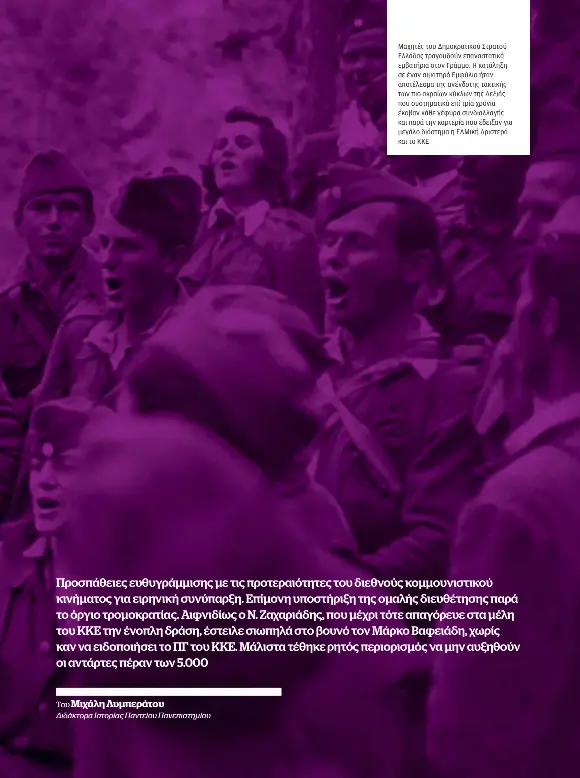 Προσπάθειες ευθυγράμμισης με τις προτεραιότητες του διεθνούς κομμουνιστικού κινήματος για ειρηνική συνύπαρξη. Επίμονη υποστήριξη της ομαλής διευθέτησης παρά το όργιο τρομοκρατίας. Αιφνιδίως ο Ν. Ζαχαριάδης, που μέχρι τότε απαγόρευε στα μέλη του ΚΚΕ την ένοπλη δράση, έστειλε σιωπηλά στο βουνό τον Μάρκο Βαφειάδη, χωρίς καν να ειδοποιήσει το ΠΓ του ΚΚΕ. Μάλιστα τέθηκε ρητός περιορισμός να μην αυξηθούν οι αντάρτες πέραν των 5.000